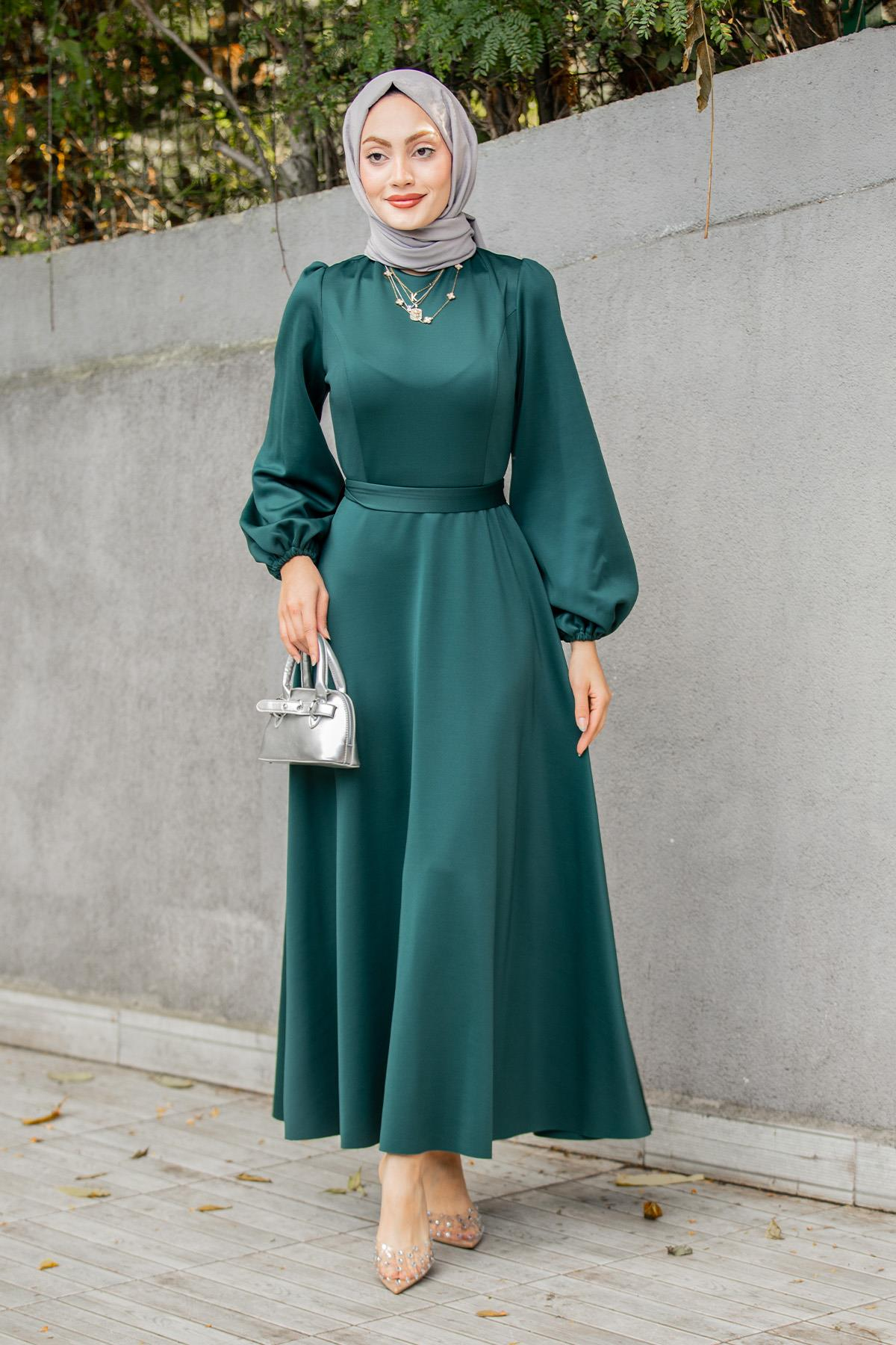 Luvi Pufy Dalgıç Balon Kollu Elbise-Zümrüt (Tesettür01301)