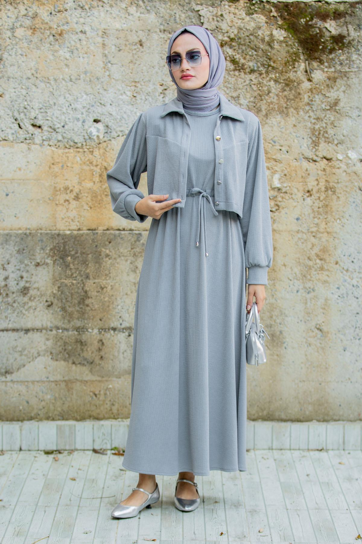 Missa Fitilli Ceket Jile Elbiseli Takım-Gri (Tesettür01298)