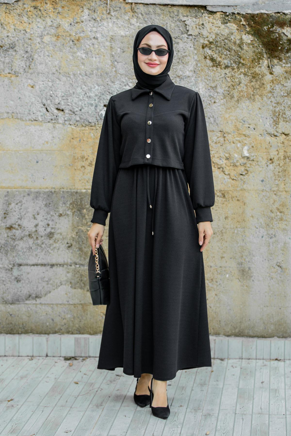 Missa Fitilli Ceket Jile Elbiseli Takım-Siyah (Tesettür01298)