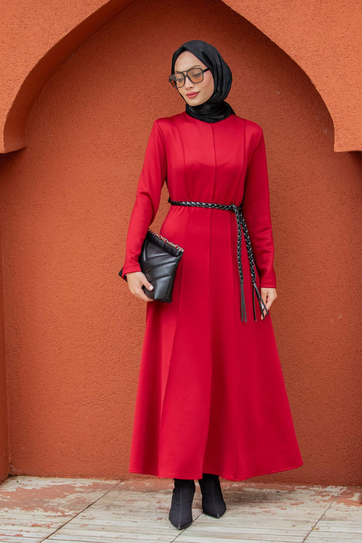 Seyra 8 Parçalı Deri Örgü Kemerli Pufy Dalgıç Elbise-Bordo (Tesettür01306)