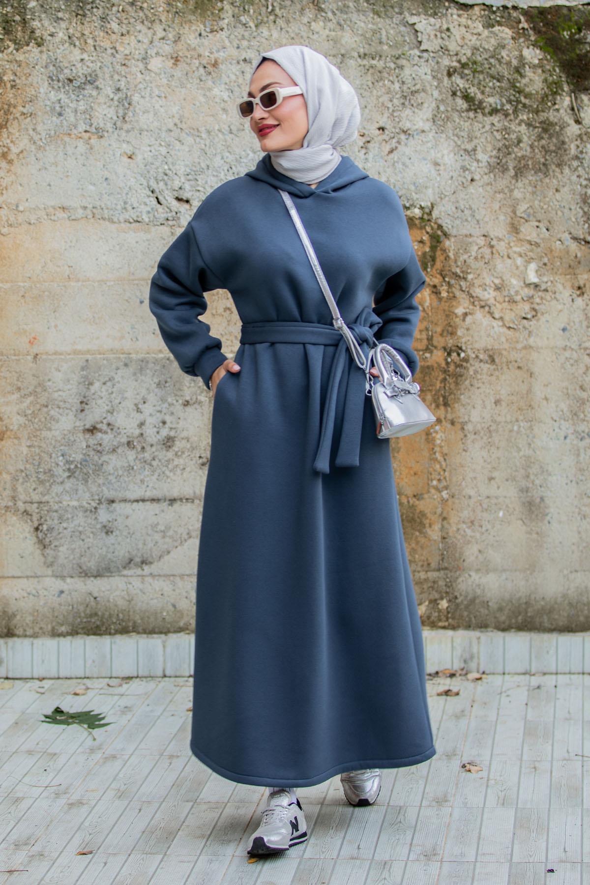 Üç İplik Şardonlu Kapşonlu Spor Elbise-Mavi (Tesettür01308)