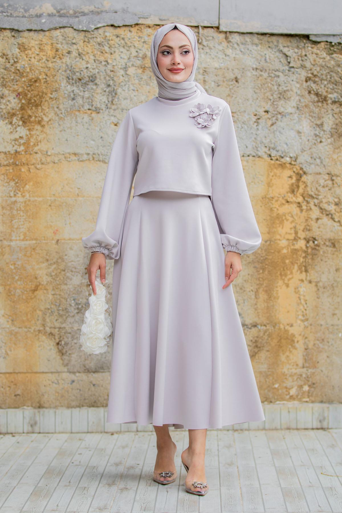 Yaka Çiçekli Puf Dalgıç Etekli Takım-AçıkGri (Tesettür01295)
