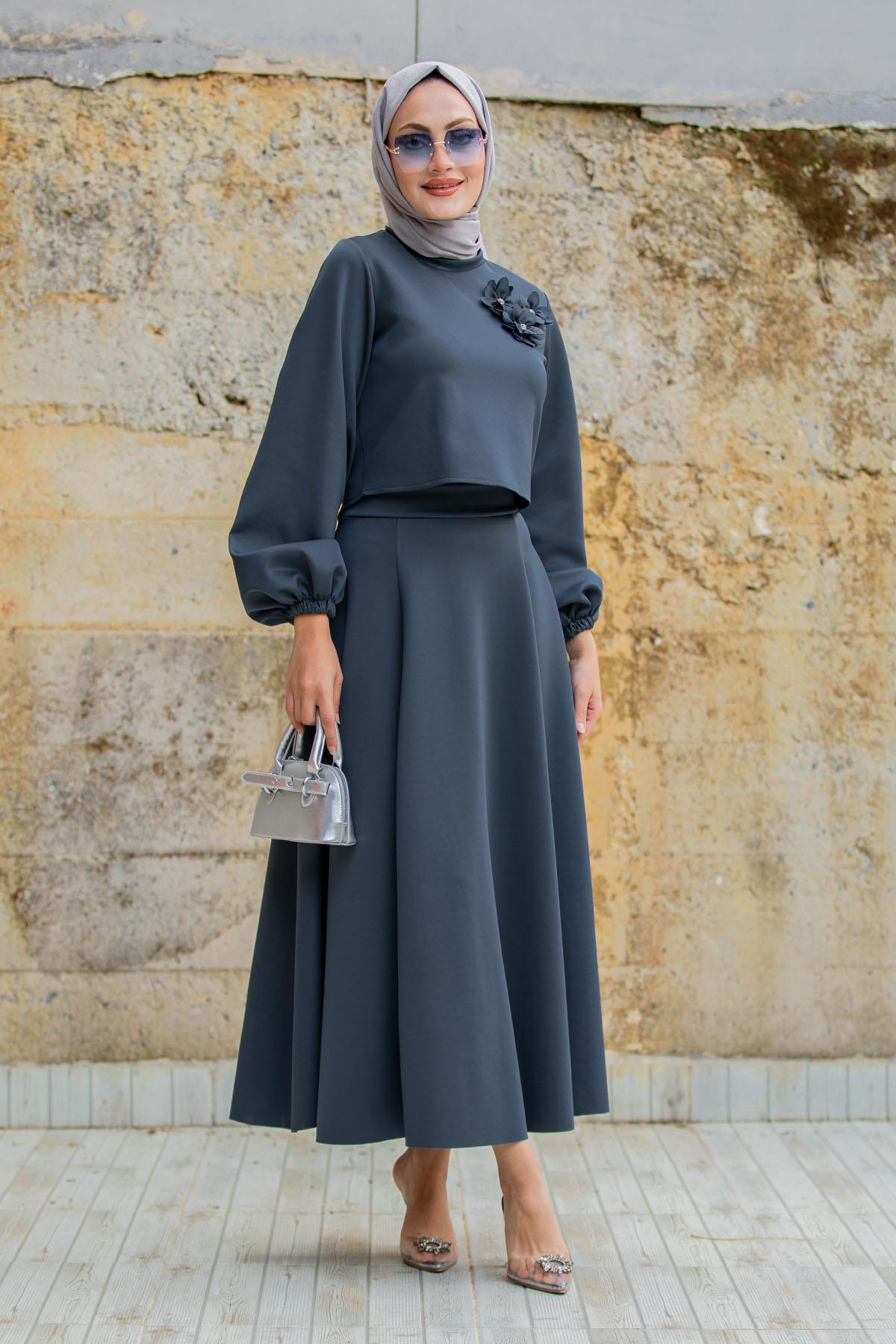 Yaka Çiçekli Puf Dalgıç Etekli Takım-Antrasit (Tesettür01295)